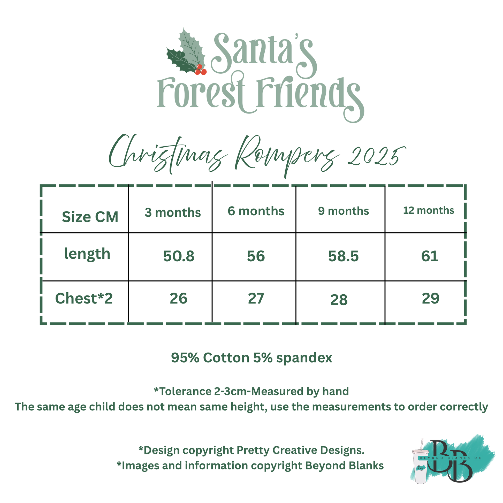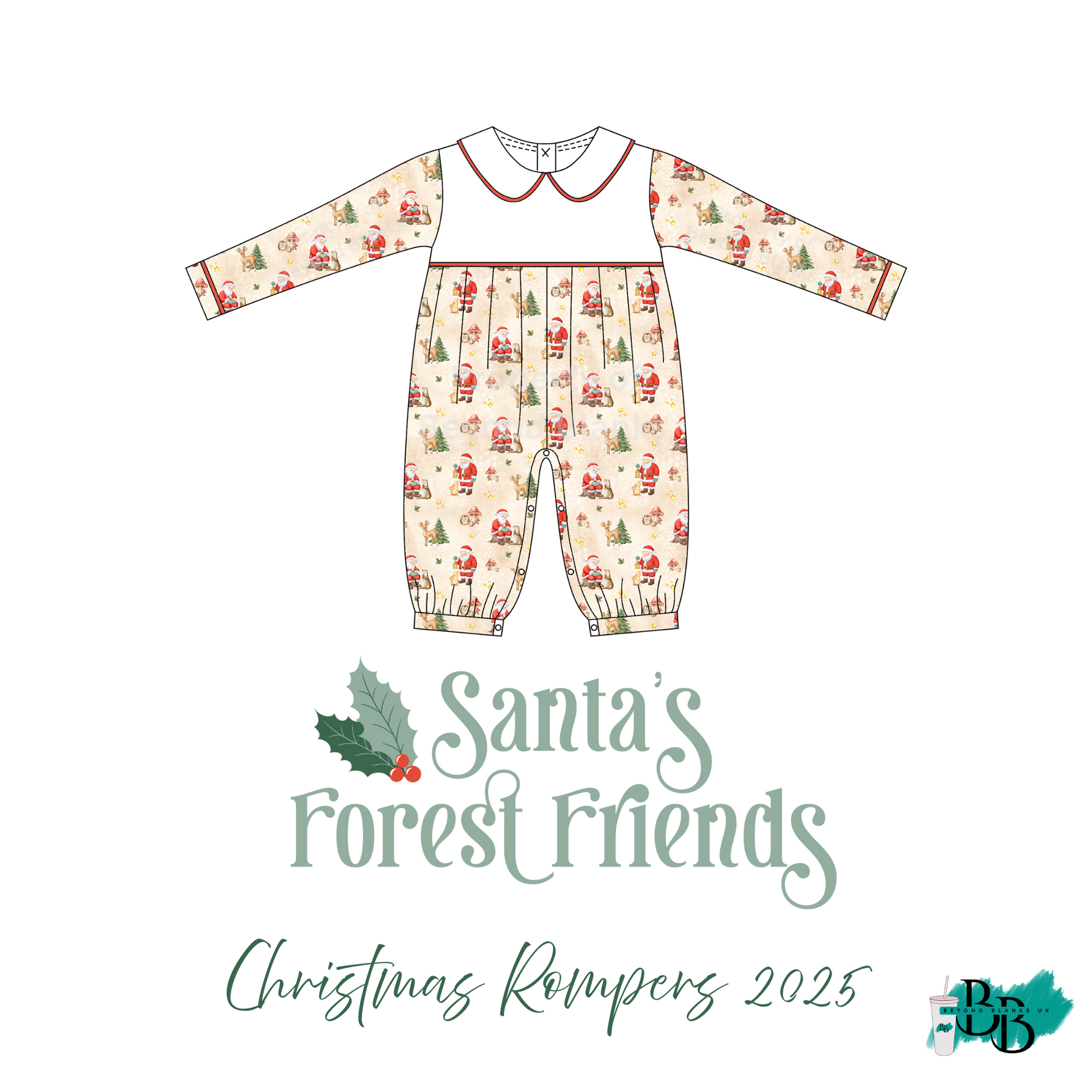 Welcome to Santa's Forest Friends, stunning hand drawn artwork by Pretty Creative Designs. Christmas 2025 collaboration of matching Christmas Family Rompers in gorgeous cotton with a pan collar, Finish them with a personal touch for a perfect Christmas!